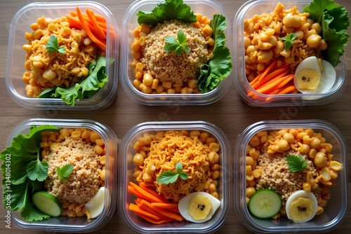 Top-down view of pre-packaged Thai meals, ideal for delivery and meal prep services