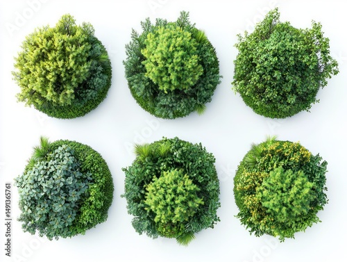 Top-down view of six round green tree and shrub arrangements with varied foliage and textures set against a white background representing diverse greenery clusters