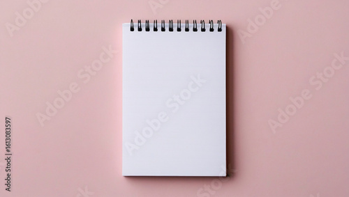Top-down view of vertical rectangular spiral notepad on soft pink background. Black wire binding and crisp white pages. Perfect for minimalist office and stationery themes