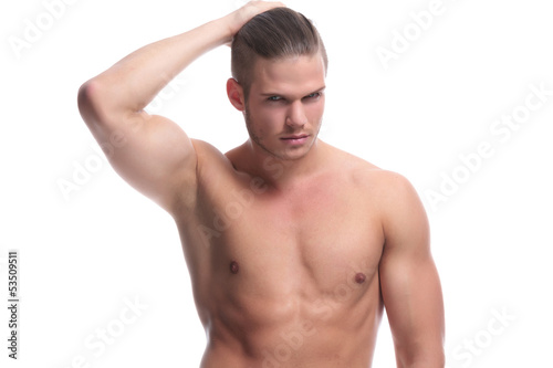topless fashion man holds his hair