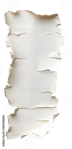 Torn and textured white paper sheet with irregular edges, suitable for backgrounds or overlays