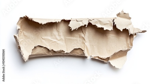 Torn Paper Fragment, a jagged hole in distressed paper, showcasing intricate edges and textures, set against a clean white backdrop for striking contrast and emphasis.