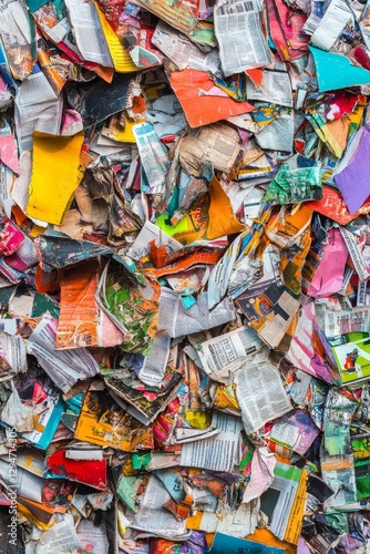 Torn paper pieces creating a colorful abstract view of recycled
