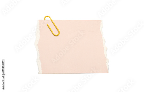 Torn pastel pink paper sheet with a yellow paperclip isolated on a transparent background,