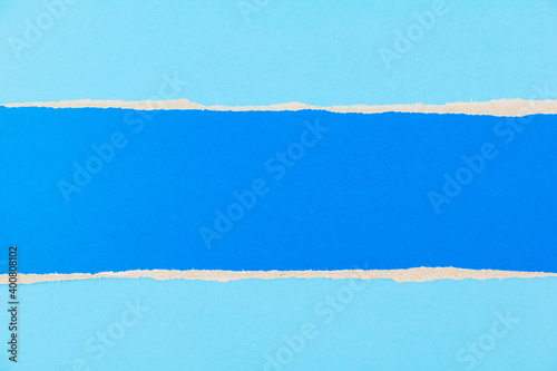 Torn piece of blue cardboard on blue paper background. Stripe of blue cardboard with copy space for text.