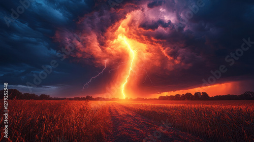Tornado funnel cutting through farmland, with streaks of lightning illuminating the scene