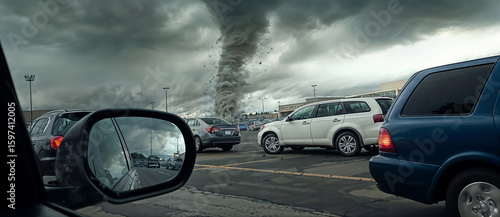 Tornado over city traffic. Cars are stuck in the jam. Grey whirlwind over parking lot. Illustration for insurance companies