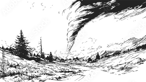 Tornado sketch hand drawn landscape with dramatic sky and rural field — stock vector