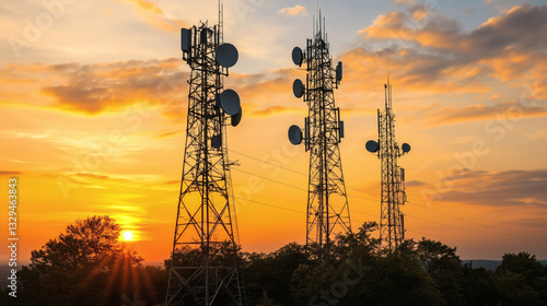 Torres de telecomunicaciones al atardecer en un paisaje rural
