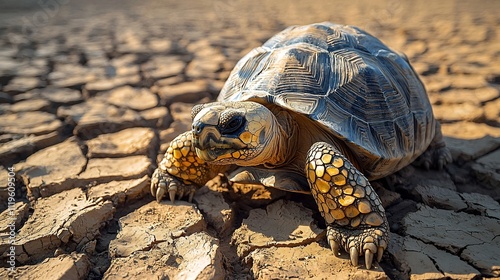 Tortoise Slowly Traversing Parched Desert Landscape in Scorching Sunlight