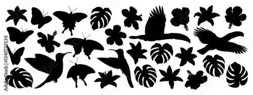 Toucans, hummingbirds, monstera leaves, various flowers and butterflies on transparent background, black silhouette illustrations, tropical illustration collection
