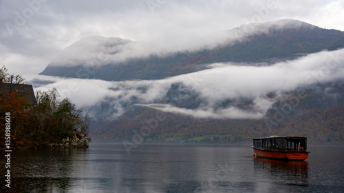 Tour boat sailing on a lake with misty mountains in the background. Lake Bohinj Slovenia