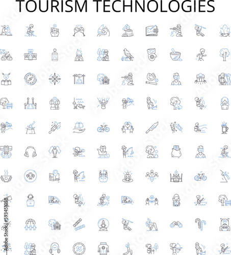 Tourism technologies outline icons collection. Tourism, Technologies, Travel, Innovation, Mobile, Applications, Automation vector illustration set. Software, Digital, Social linear signs