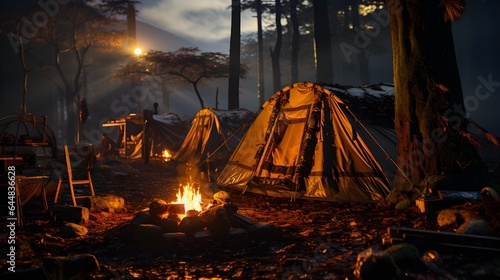 Tourist Camp With Tents Set Up In The Forest. Illustration On The Theme Of Travel And Tourism, Recreation And Relaxation . Generative AI