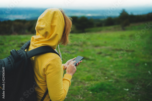 tourist girl on background green grass using mobile smart phone, person holding in female hands gadget technology, texting finger message on screen content online wifi internet lifestyle concept