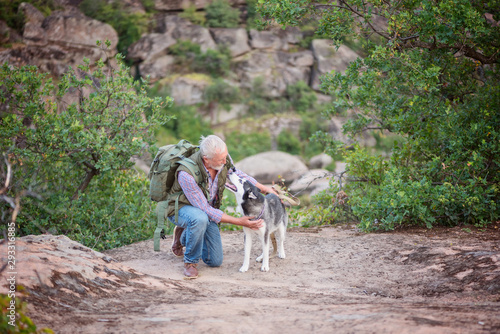 Tourist man with a gray beard with his dog breed of husky against the backdrop of trees, gorges and stones, concept of tourism and outdoor activities in old age with animals