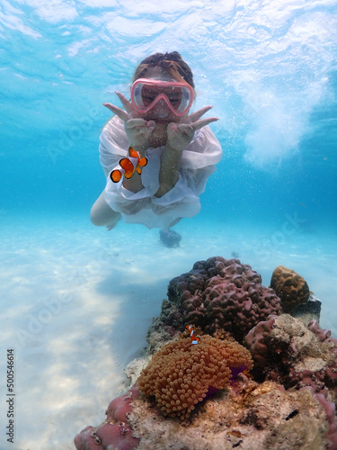 Tourist people diving with snorkel to see nemo fish , beautiful fish and coral at Samaesarn Island of Thailand
