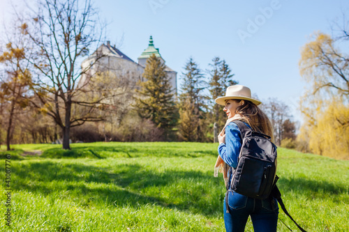 Tourist walking in Olesko Castle garden. Ancient architecture landmarks in Western Ukraine. Traveling