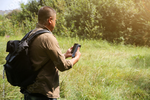 Tourist with smartphone and battery charger is looking for the way in summer forest. Guy with powerbank is lost in the nature. Modern technologies concept to stay always online and in touch.