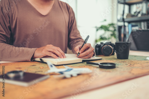 tourist writing on book before travel in vocation, holidays or long weeked on world map. Travel , Adventure and Discovery concept.