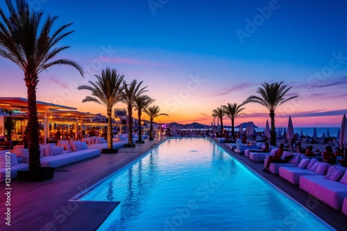 Tourists relaxing at infinity pool during beautiful sunset in ibiza, spain