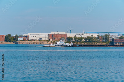 towboat pushes dry bulk cargo barge on the river past the industrial landscape