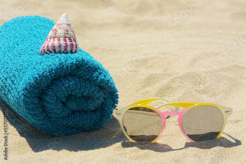 Towel with stylish sunglasses and seashell on sand outdoors, closeup. Beach accessories