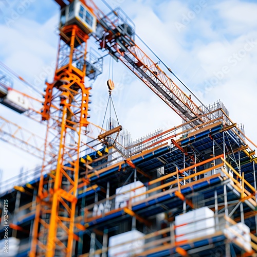 Tower crane lifting prefabricated bathroom units for a hotel, modular construction Tall and powerful, precise and efficient, hospitality development