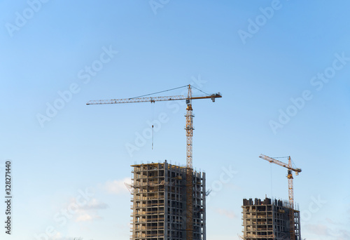 Tower cranes working at construction site against blue sky. Crane lifting a concrete bucket. Construction process of the new residential buildings. Transportation blocks and pouring of the cement mix