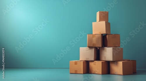 tower made of cardboard boxes. solid blue green background. delivery advertising concept. copy space