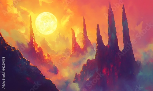 Towering Cliffs and a Large Sun in a Fiery Sky