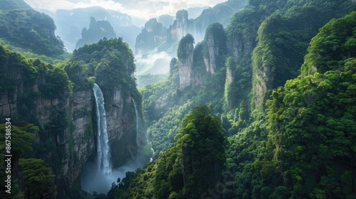 Towering mountains with dense green forests and a breathtaking waterfall.