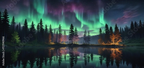 Towering trees and glowing aurora lights reflected in a peaceful lake at dawn, serene, aurora borealis, lake