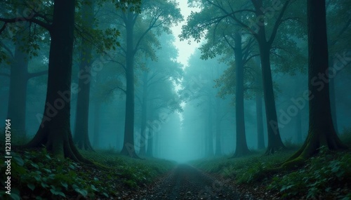 Towering trees in a misty, mysterious forest atmosphere, outdoorsy, foliage