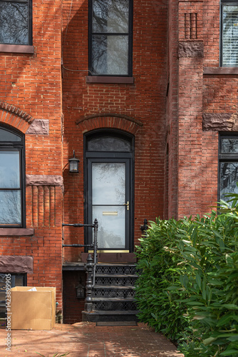 Townhouses in central Washington DC. Entryway, porch on a red brick home.