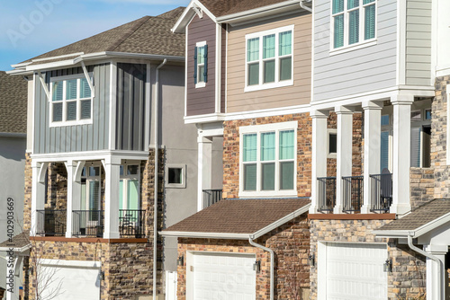 Townhouses with balconies and garages at the facade on a sunny day landscape