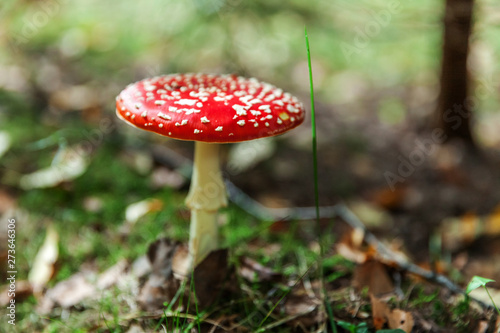 Toxic and hallucinogen mushroom Fly Agaric in grass on autumn forest background. Red poisonous Amanita Muscaria fungus macro close up in natural environment. Inspirational natural fall landscape