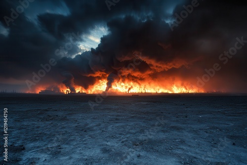 Toxins and pollution from industry. Vivid flames and smoke rising against a dark, stormy sky.