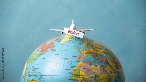 Toy airplane labeled Explore flies over colorful globe, symbolizing spirit of adventure and travel.