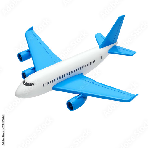 Toy airplane with a white body and bright blue wings, isolated on black background