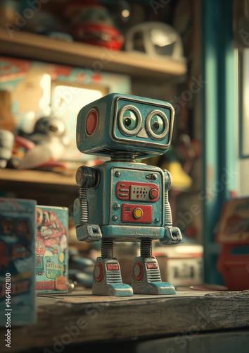 Toy robot adorned with retro buttons and shiny chrome arms for a nostalgic and playful collectible design