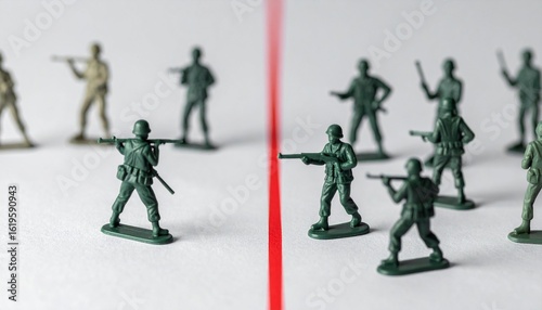 Toy soldiers standing on opposite sides of a red line, representing conflict and division. The miniature soldiers are poised for battle