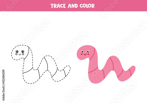 Trace and color cute worm. Worksheet for kids.