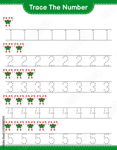 Trace the number. Tracing number with Candy Canes. Educational children game, printable worksheet, vector illustration