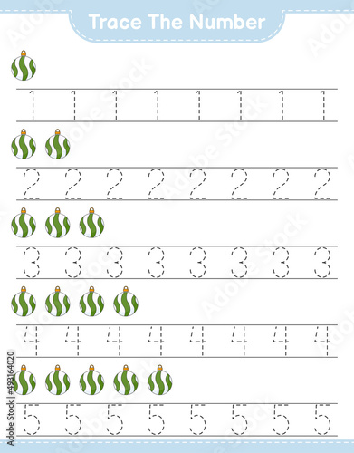 Trace the number. Tracing number with Christmas Ball. Educational children game, printable worksheet, vector illustration