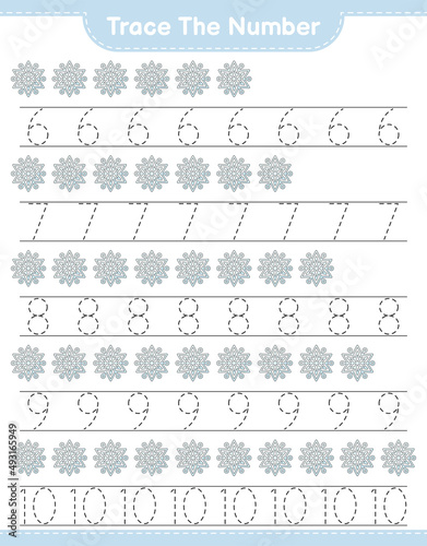 Trace the number. Tracing number with Snowflake. Educational children game, printable worksheet, vector illustration