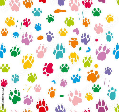 Traces of dog paws in colorful colors isolated on white. Bright seamless pattern.