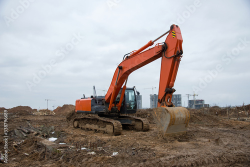 Track-type excavator during earthmoving at construction site. Backhoe digging the ground for the foundation and for laying sewer pipes district heating. Earth-moving heavy equipment