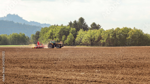 Tractor sowing in empty field on countryside, small trees in background.