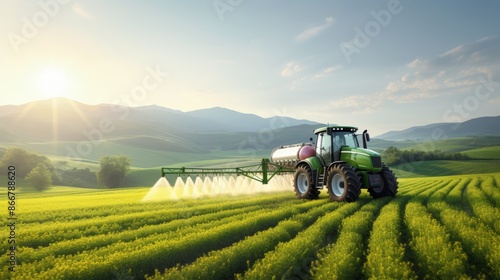Tractor spraying pesticides with sprayer on wheat field during the spring season
